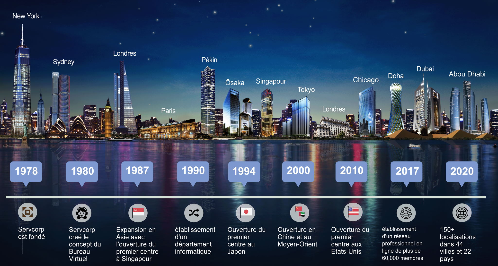 Servcorp a été fondé en 1978 en Australie par Alfred G. Moufarrige (PDG). Pionnier du secteur des bureaux équipés et des bureaux virtuels, M. Moufarrige travaille dans l’industrie des espaces de travail flexibles depuis plus de 45 ans. Servcorp est d’ailleurs le berceau du bureau virtuel, créé il y a plus de 30 ans. L’entreprise s’est internationalisée en 1987 et compte aujourd’hui plus de 150 implantations dans plus de 40 villes et 19 pays à travers le monde.