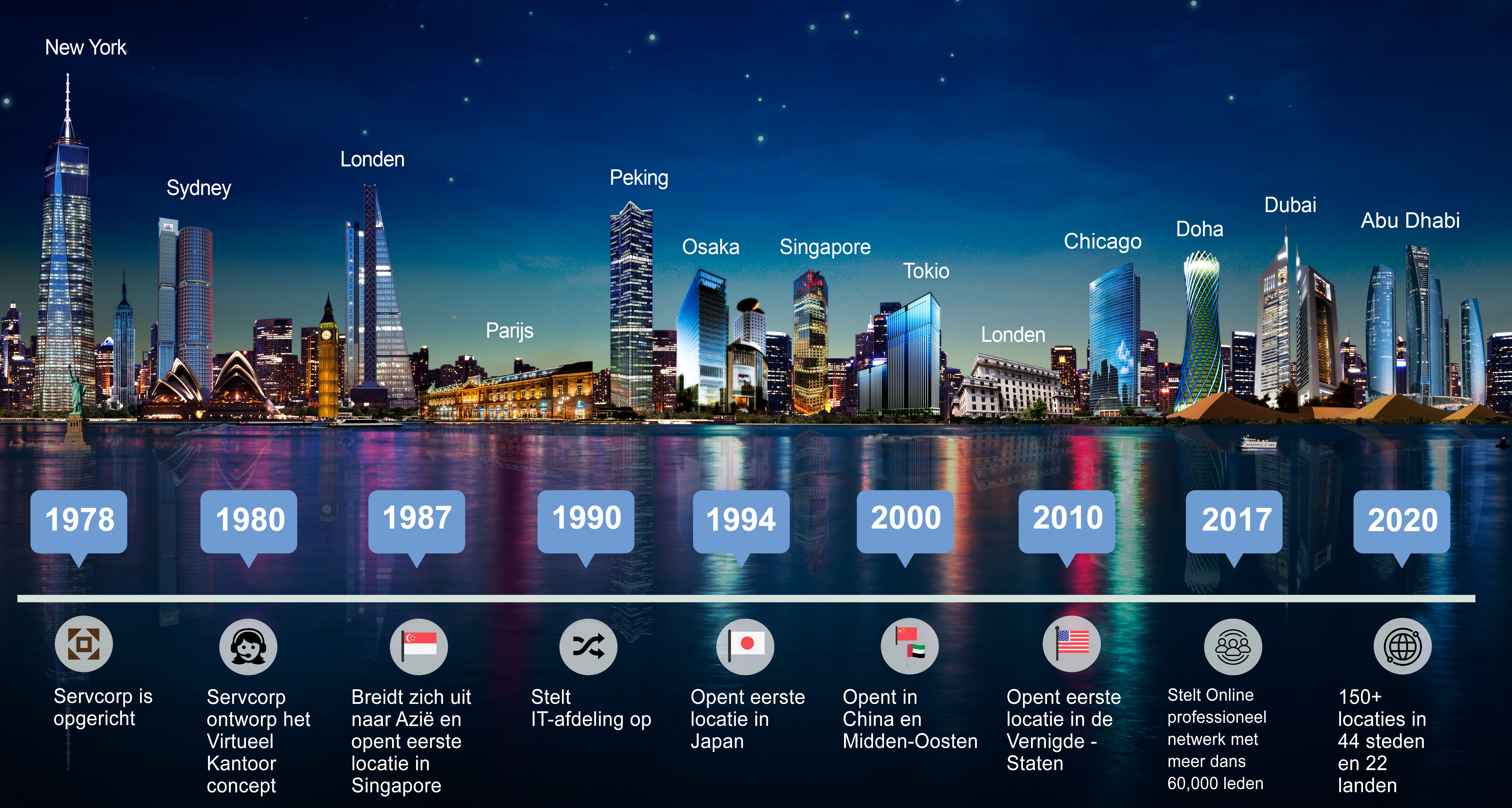 | Bedrijfsoverzicht | Met het aanbod van ’s werelds beste Serviced Offices, Virtual Offices, Coworking-ruimtes en vergaderruimtes beschikt het bedrijf over meer dan 150 locaties in 41 steden in 20 landen, waaronder: One World Trade Center, 85e verdieping (New York); Marunouchi Trust Tower, 20e verdieping (Tokio); Marunouchi Nijubashi Building, 2e & 3e verdieping (Tokio); The Hilton Plaza West Office Tower, 18e & 19e verdieping (Osaka); The Leadenhall Building, 30e verdieping (Londen); International Finance Centre 2; The Etihad Towers, 36e verdieping (Abu Dhabi); Marina Bay Financial Centre, 39e verdieping (Singapore), en meer. |